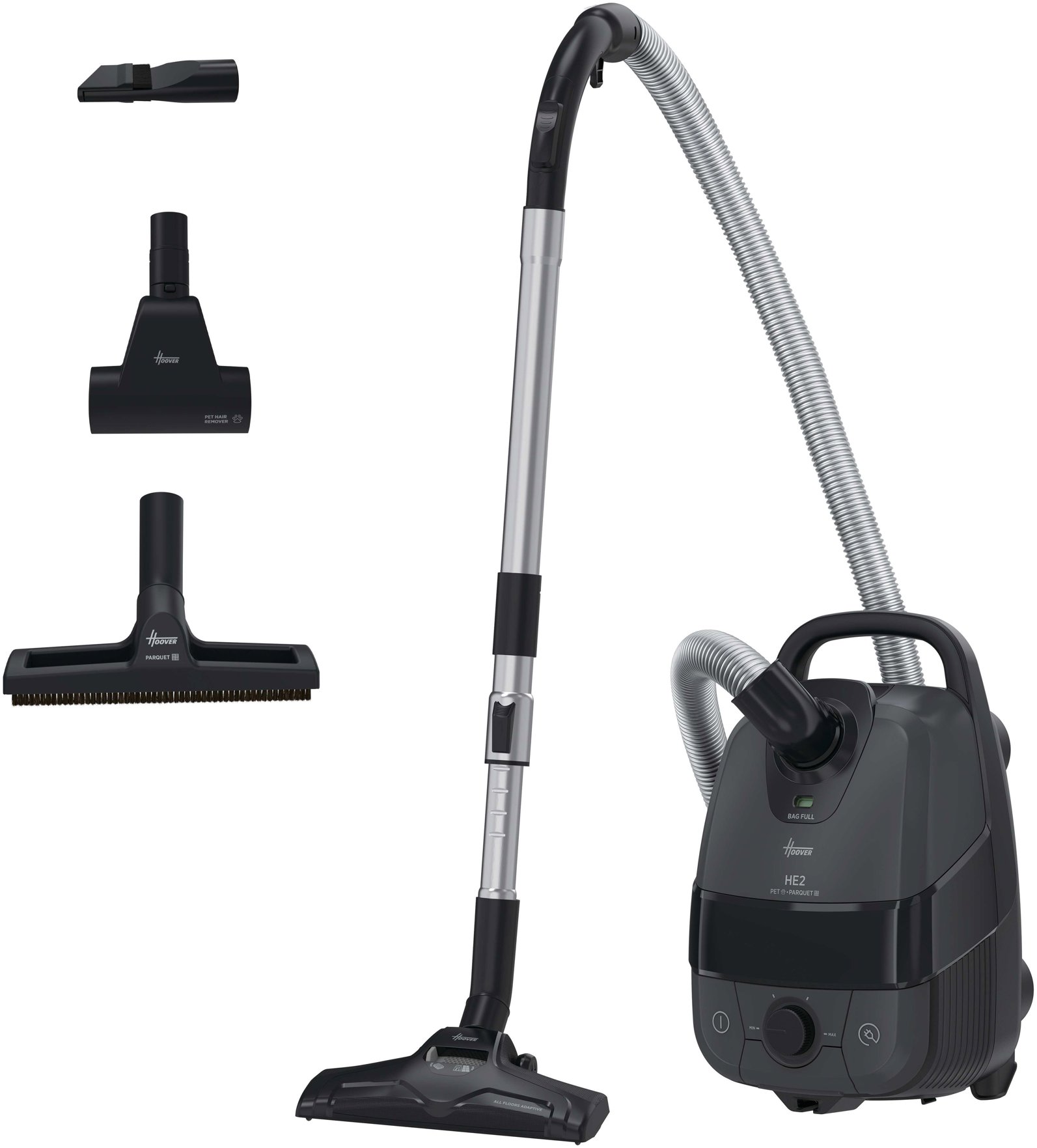 Vreckový vysávač – s káblom, na všetky druhy podláh, na zvieracie chlpy, na vysávanie, bez oklepu, EPA a mikrofilter, príkon 850 W, hlučnosť 70 dB, plastová zberná nádoba s objemom 3,5 l, ovládanie na tele, dĺžka kábla 7,5 m, akčný rádius 10 m, automatické navíjanie kábla, indikátor plného koša, regulácia výkonu, mäkčené kolieska a svetelné kontrolky, s teleskopickou trubicou, s hadicou, rozmery 27,3 × 25 × 43 cm (V׊×H), hmotnosť 4,91 kg, sivá a čierna farba Hoover HE2: Výkonný, ľahký a skladnýBezchybný výkon a jednoduchá manipulácia v kompaktných rozmerochHOOVER HE210P 011 HE2 PET je vreckový vysávač s príkonom 850 W, ktorý ponúka špičkové výsledky a per