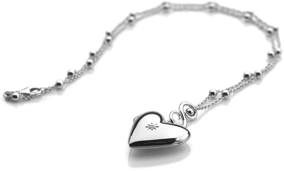 Náhrdelník – dámsky, klasický, retiazkový, s príveskom a s medailónikom, motív prívesku srdce, striebro 925/1000, lesklá povrchová úprava, ródiovaný, hmotnosť 6,3 g, do náhrdelníka sú zasadené diamanty, s 1 diamantom, stupeň čistoty diamantu I3, hmotnosť diamantu 0,02 kt, dĺžka 46 cm, rozmery 3,2 × 2 cm (V׊) Náhrdelník HOT DIAMONDS bude obľúbeným šperkom všetkých žien. Výrobný materiál tvorí striebro. Striebro má veľmi elegantný vzhľad, z toho dôvodu bude vhodný k väčšine oblečenia. O definitívny lesk náh