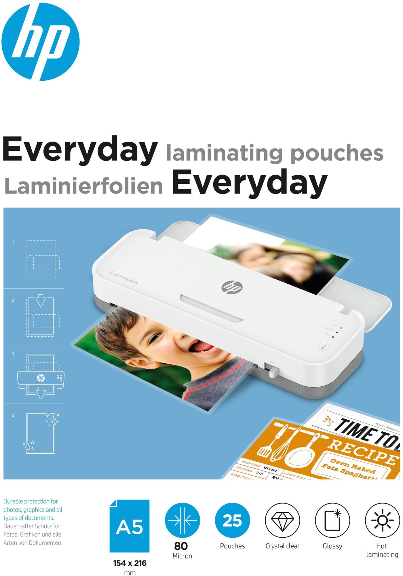 Laminovacia fólia – A5, 25 kusov v balení, na dokumenty a fotografie, hrúbka fólie 80 mikrónov, lesklá, laminácia za tepla, vhodná pre všetky typy stolných laminátorov, zvýrazňujúca vzhľad dokumentu a s uv filtrom Zásadné vlastnosti laminovacej fólie HP Everyday A5 80 Micron, 25 ks Lesklá laminovacia fólia HP tlačoviny spevní a zvýši ich odolnosť Ochráni pred pokrčením, vlhkosťou, prachom Zvýrazní vzhľad vašic
