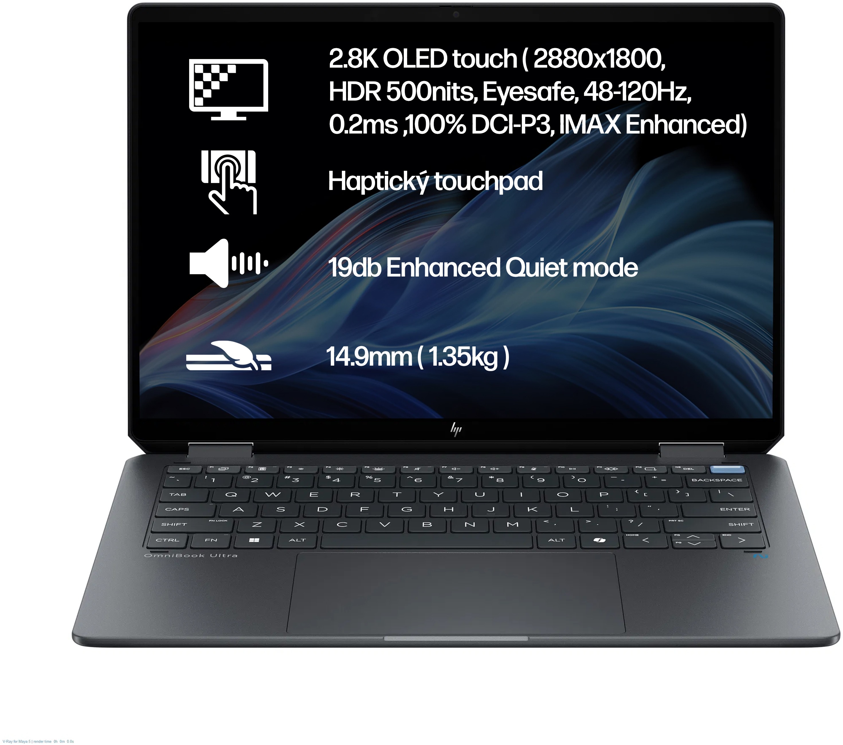 Tablet PC – Intel Core Ultra 9 288V, dotykový 14″ OLED lesklý 2880 × 1800 120 Hz, RAM 32 GB LPDDR5x, Intel Intel Arc Graphics 140V, SSD 2000 GB, podsvietená klávesnica, webkamera, USB-C, čítačka odtlačkov prstov, WiFi 7, WiFi, Bluetooth, hmotnosť 1,47 kg, Windows 11 Pro HP OmniBook Ultra Flip 14-fh0002nc Eclipse GrayNotebook novej generácie s AI a flexibilnou konštrukciouNotebook HP OmniBook Ultra Flip 14 je vybavený výkonným procesorom Intel Core Ultra s podporou um
