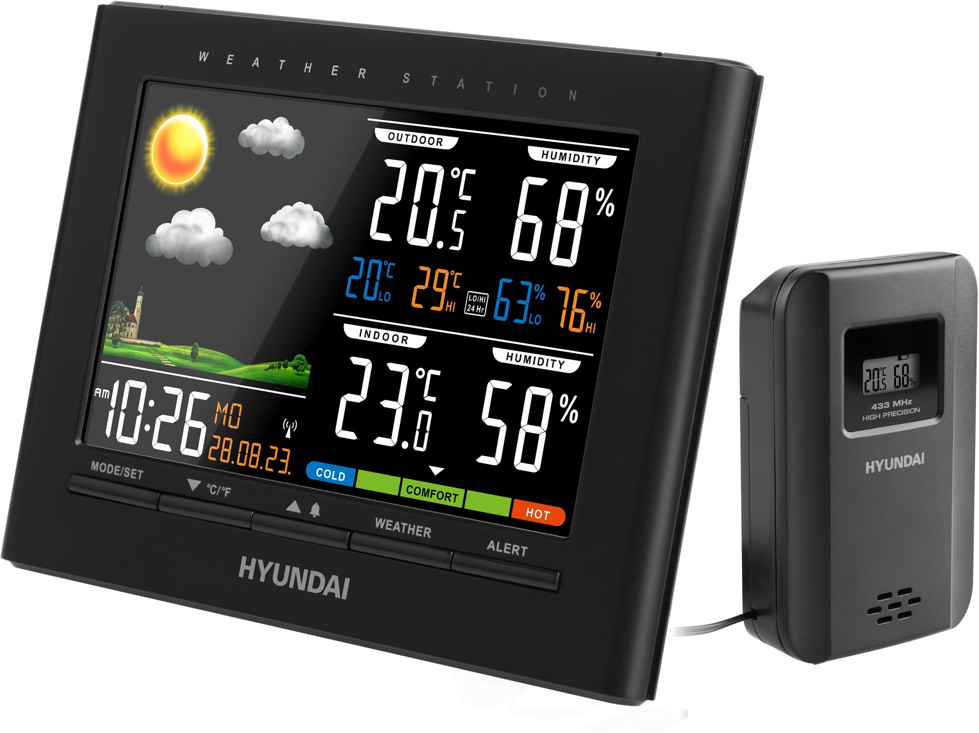 Meteostanica – domáca, bezdrôtová, pripojenie cez rádiové vlny, vnútorná a vonkajšia, s predpoveďou a sledovaním aktuálneho počasia, budík, indikácia slabej batérie, alarm meraných veličín a príjem DCF, meranie barometrického tlaku, teplotného indexu, teploty, vlhkosti, zobrazuje čas, dátum a kalendár, dosah bezdrôtového snímača 70 m, maximálne možno pripojiť 1 bezdrôtový snímač, uzatvorený systém, využitie samostatne, do siete aj na batérie, hlavná jednotka, snímač a manuál súčasťou balenia, umiestnenie na stenu a na stôl, rozmery 125 × 170 × 26 mm (V׊×H) Meteostanica Hyundai WS 4380 vám ponúkne aktuálny prehľad o teplote, vlhkosti, barometrickom tlaku aj tepelnom indexe. Vďaka bezdrôtovému snímaču s dosahom až 70 metrov získate presné dáta o vonkajšíc