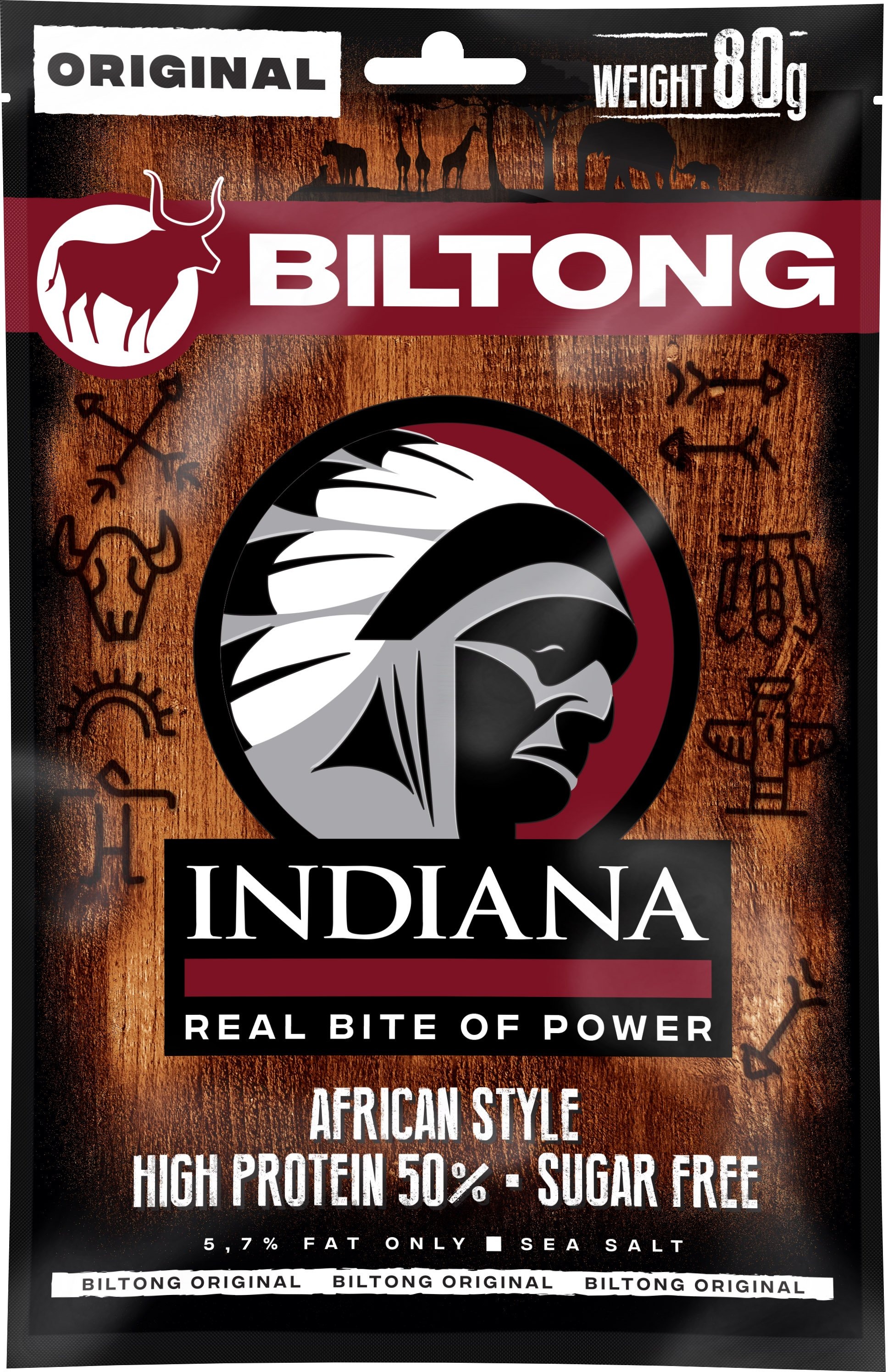 Sušené mäso – biltong, hovädzie, Low sugar, bez laktózy, palmového oleja, pridaného cukru, 100 g obsahuje 220 g surového mäsa, 50 g bielkovín a 276 kcal, hmotnosť 80 g Indiana Sušené mäsoBiltong hovädzie Original, 80 gSušené hovädzie mäso Indiana Biltong Original 80 g je desiata, ktorá vám ponúkne vysoký obsah bielkovín a skvelú chuť. Bez pridaného cukru je ideálny