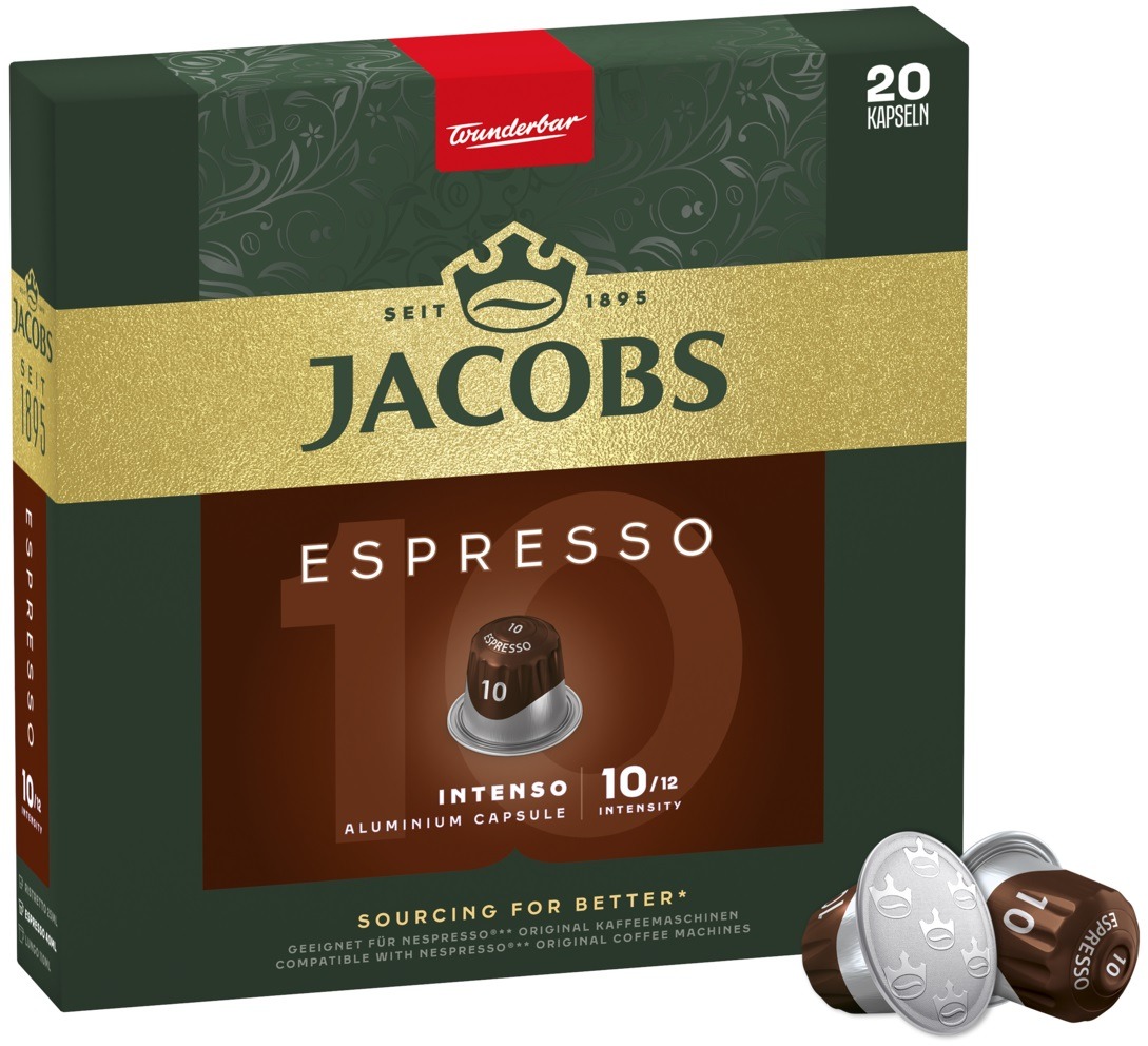 Kávové kapsuly – na káva bez sušeného mlieka, zmes kávových odrôd, dark (intenzita 10), drevité a sladové tóny, veľkosť šálky Espresso, materiál kapsuly hliník, 20 kapsúl v balení Jacobs Espresso IntensoIntenzita 10, 20 kapsúl, kompatibilná s kávovarmi Nespresso OriginalKávové kapsuly Jacobs Espresso Intenso vám umožnia pripraviť kávu v kávovaroch Nespresso Original. Obsahujú z