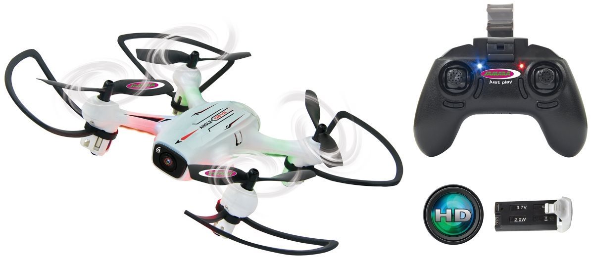 Dron s kamerou – HD rozlíšenie videa, maximálna veľkosť SD karty 4 GB, max. rýchlosť 40 km/h, doba chodu 10 min, autopristátie a autoštart, rozmery v rozloženom stave 4 × 17,5 × 17,5 cm (V׊×D), hmotnosť 60 g, legislatívna podkategória A1 Jamara Angle 120 je veľký, robustný a ľahký dron, ktorý sa ľahko ovláda a je vybavený inteligentným LED osvetlením (červená/zelená) s ukazovateľom smeru a varovným signálom nízkej úrovne batérie, ktor