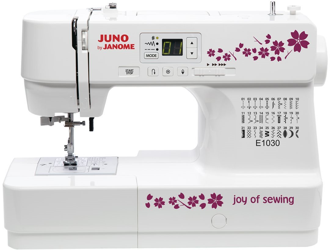 Šijací stroj – elektronický, automatické navliekanie ihly, dekoratívny a overlockový steh, šírka stehu 7 mm, dĺžka stehu 5 mm, rýchlosť šitia 820 stehov/min, automatická jednokroková gombíková dierka, 30 šijacích programov, pätka univerzálna, pätka vyšívacia, cievka, ihly, páradlo, štetček a pedál súčasťou balenia, rozmery 38 × 28 × 17 cm (Š×V×H), hmotnosť 5,8 kg Elektronický šijací stroj Janome Juno E1030 zaujme všetkých začiatočníkov aj pokročilých, ktorí sa venujú domácemu a rekreačnému šitiu. Ponúka 1 typ automatickej gombíkovej dierky a celkom 30