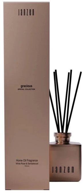 Tyčinkový difuzér – kvetinová a drevitá vôňa s výdržou 56 d, sklenená nádoba, 6 tyčiniek, objem 200 ml Tyčinkový difuzér JANZEN – Gracious je výrazná kompozice suchého jantaru a cedrového dřeva, zjemněná dotekem bílé růže. Bílá růže má éterickou a čistou vůni – svěží, lehce nasládlou, s jemnými zeleným