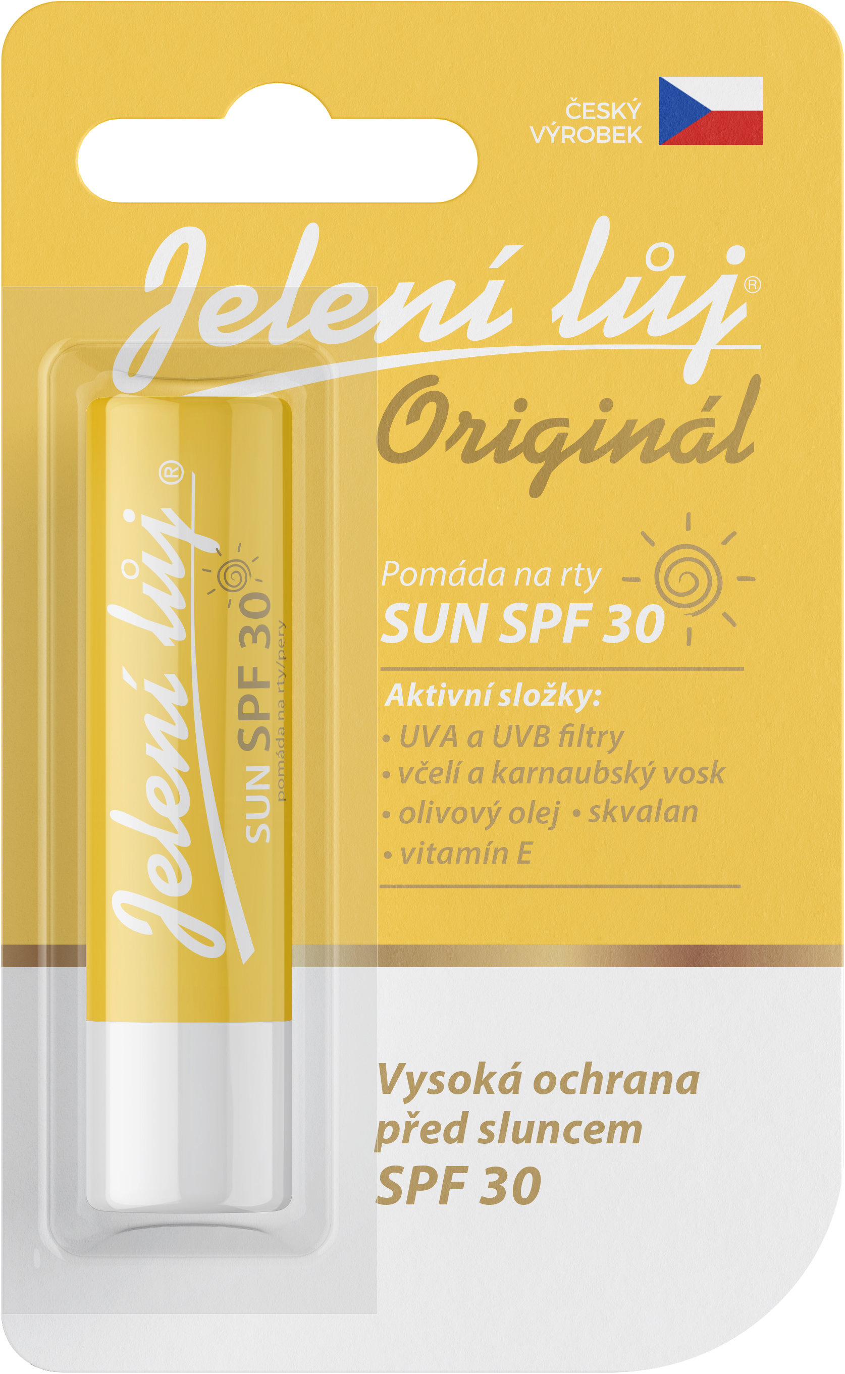 Balzam na pery – vyhotovenie ekologické, regeneračný a ochrana proti vonkajším vplyvom, ochranný faktor 30 SPF, bez parfumovania Balzam na pery JELENÍ LOJ v blistri Sun SPF 30 chráni pred slnkom v letných aj zimných mesiacoch. Na krátkej prechádzke alebo horskej túre, pri vode, na zjazdovke, pri akomkoľvek vonkajšom športe, pre