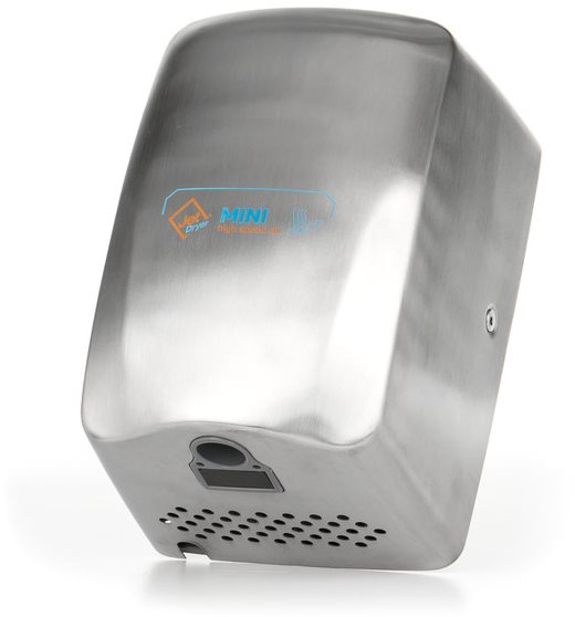 Sušič rúk – teplovzdušný, automatické zapínanie, s ohrevom vzduchu, sériový komutátorový motor, materiál krytu kov Sušič rúk JET DRYER MINI v striebornom dizajne je skvelou ekologickejšou náhradou papierových obrúskov. Je vytvorený z antikorovej ocele a k stene zaistený bezpečnostnými skrutkami. Vďaka kompaktným r