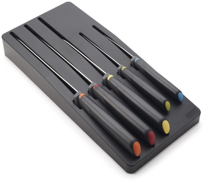 Príborník do zásuvky 15,5 cm – plastový, výška 4,6 cm, hĺbka 33,7 cm, 5 priehradiek, sivá farba Zásuvkový organizér so súpravou 5 nožov Joseph Joseph Elevate Knives Store 10545. Kľúčové vlastnosti súpravy nožov so zásuvkovým organizérom Joseph Joseph Elevate 10545Kuchynské nože z japonskej nehrd