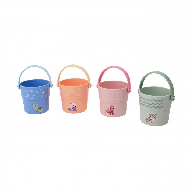 Tégliky do vody – vhodné od narodenia, skladací a stohovateľné, na výuku farieb, materiál plast, 4 kusy v balení Súprava plastových kalíškov so zvieratkami z kolekcie The Wildies Family. Plastové kalíšky s úchytmi a veselými obrázkami zvieratiek, zospodu majú dierky vhodné na hranie vo vode či na piesku. Ideálne