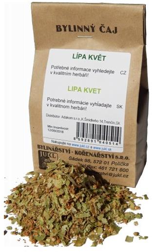 Čaj – bylinný, sypaný, jednodruhový, hmotnosť 50 g Jukl Lipa kvet50 gPrečo piť čaj Jukl Lipa kvet? Má silné potopudné, močopudné účinky. Uvoľňuje dýchacie cesty, upokojuje nervy, prehlbuje spánok a podporuje trávenie. BaleniePapierové vrecko 50 g nett