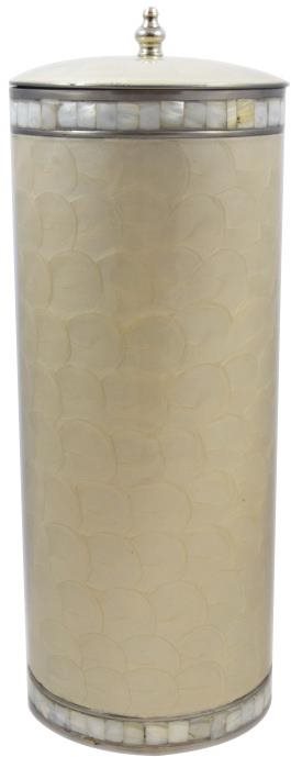 Zásobník na toaletný papier – samostatne stojací, využije ho domácnosť, kruhový tvar základne, rozmery 40 × 14,5 × 14,5 cm (V׊×H) Schránka vám umožní ponechať na vašom WC zásobu štyroch roliek toaletného papiera, napriek tomu nebudú vidieť. Schránka je vyrobená z nehrdzavejúcej ocele, je potiahnutá bielou perleťovou farbou a uza