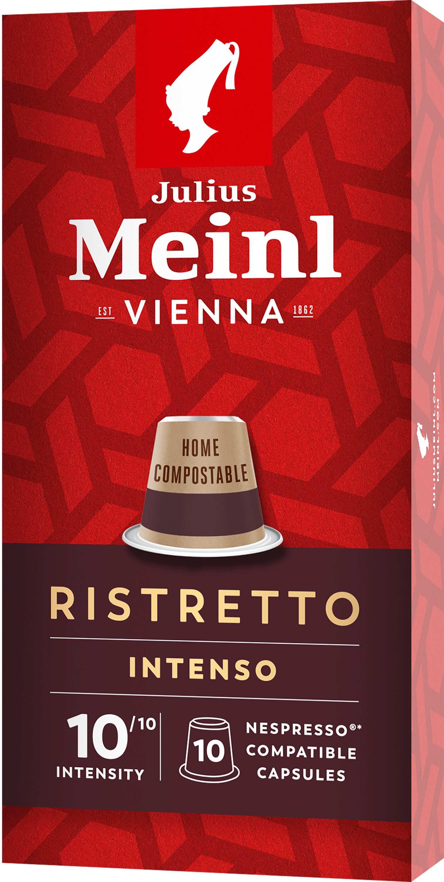 Kávové kapsuly – na káva bez sušeného mlieka, zmes kávových odrôd, dark (intenzita 10), sladové tóny, pôvod kávy Južná Amerika, materiál kapsuly bioplast, 10 kapsúl v balení Julius Meinl Ristretto IntensoKávové kompostovateľné kapsuly, 10 ksJulius Meinl Ristretto IntensoTmavo pražená prémiová kávová zmes obsahuje prvotriednu arabiku z Južnej Ameriky a východnej Afriky spo