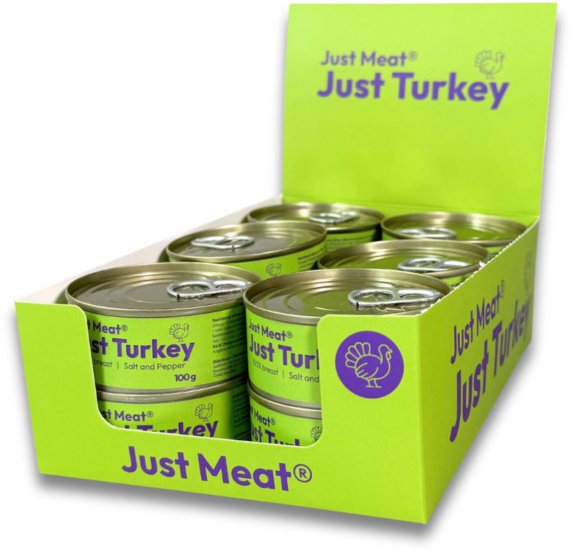 Konzerva – hotové jedlo, 100 % morčacie mäso, soľ, korenie v 100 g, bez konzervantov, bez farbív, bez umelých prísad, balenie 12× 100 g Just Meat Just Turkeysalt and pepper, 12× 100 gKonzerva Just Meat Just Turkey je praktické hotové mäsové jedlo z morčacieho mäsa, určené na okamžitú konzumáciu. Mäso pochádza z kvalitného európskeho c
