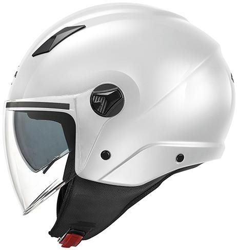Prilba na skúter – skúter, materiál škrupiny termoplast, homologizácia ECE 22.06, plexi antiscratch a antifog, int. slnečná clona, vyberateľný, prateľný a hypoalergénny interiér, odnímateľné lícnice, mikrometrická pracka, hmotnosť 1100 g (± 50 g), biela farba, veľkosť M Moderní otevřená demi jet helma z termoplastického materiálu s výsuvnou sluneční clonou. Přilba KV57 odpovídá nejnovějším požadavkům na bezpečnost a pohodlí. • Dvojitý plášť • Barva bílá lesk