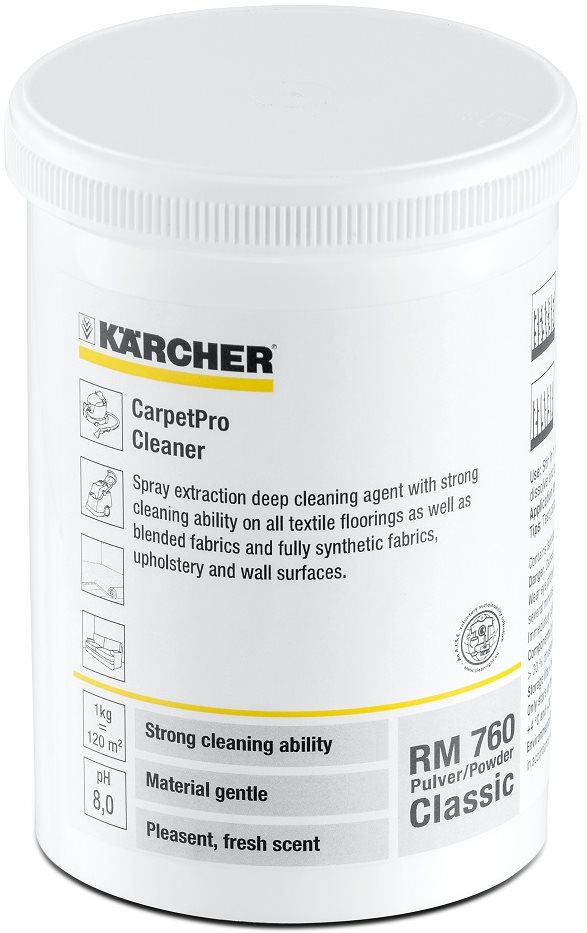 Čistič kobercov – čistič na koberce a tvrdé plochy RM 760, 800g Klasický čistiaci prostriedok Kärcher RM 760 je ideálny na hĺbkové čistenie s vynikajúcim účinkom. Je vhodný na všetky textilné podlahové krytiny a čalúnenia. Neobsahuje žiadne bieliace prostried