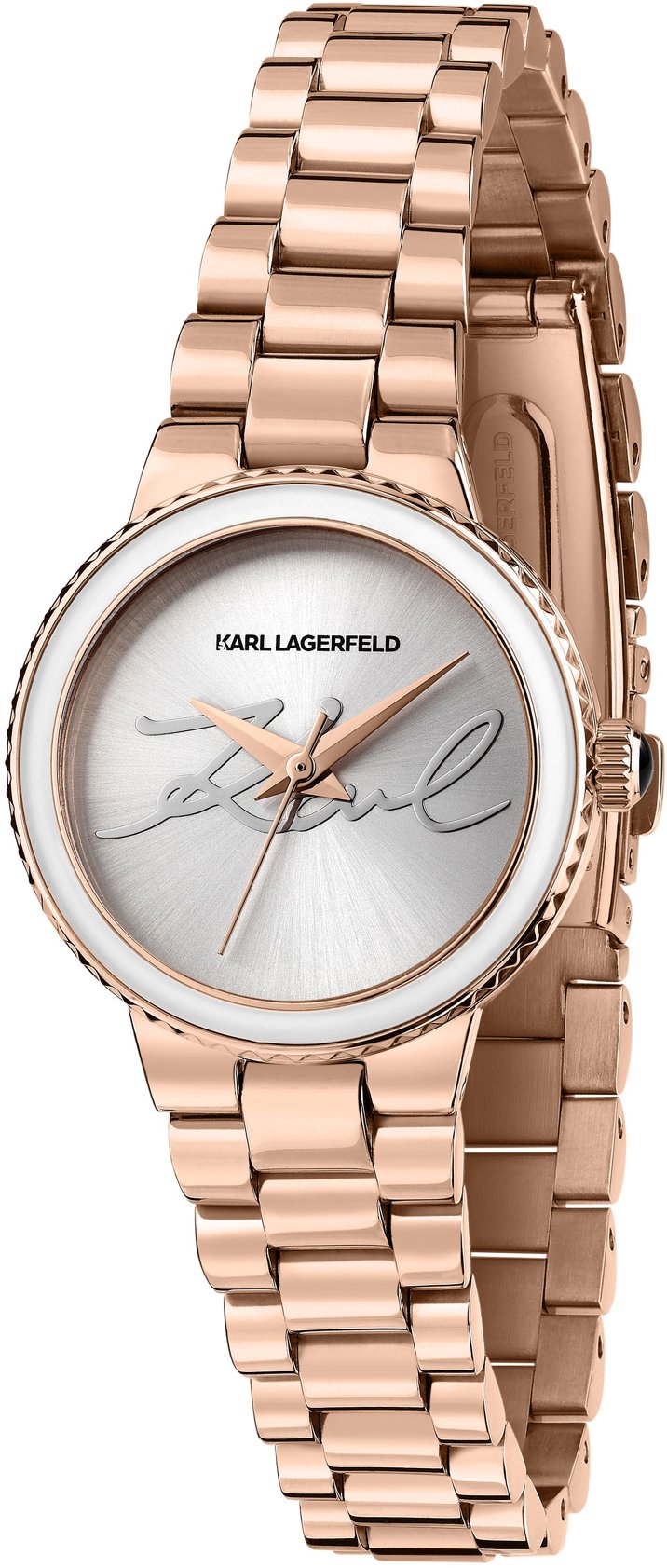 Hodinky dámske – analógové zobrazenie času, strojček quartz, okrúhly ciferník, elegantné, bez číslovania, minerálne sklíčko, vodotesnosť 50 m (5 ATM), materiál puzdra nehrdzavejúca oceľ, biela a ružovozlatá farba puzdra, materiál remienka nehrdzavejúca oceľ, ružovozlatá farba remienka KARL LAGERFELD Kaiser R0553104507 sú nadčasové dámske hodinky, na ktoré sa môžete vždy spoľahnúť. Ponúknu okrúhly ciferník široký 28 mm. Strojček Quartz je prísľubom ako vysokej presnosti, tak naozaj