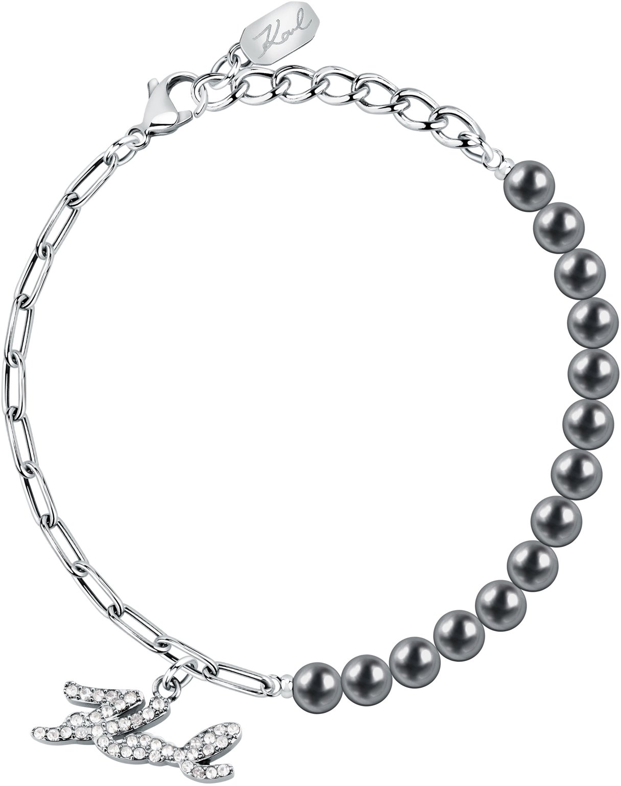Náramok – dámsky, nastaviteľný, retiazkový, s príveskom, materiál krištáľ, nehrdzavejúca oceľ a perleť, povrchová úprava lesk, perla syntetická, dĺžka 19,5 cm Chystáte sa kúpiť náramok, ktorý podčiarkne vašu krásu? Perlový náramok KARL LAGERFELD bude vhodný pre každú ženu. Materiálom náramku je krištáľ, nehrdzavejúca oceľ a perleť. Perleť sa podieľa na kryš
