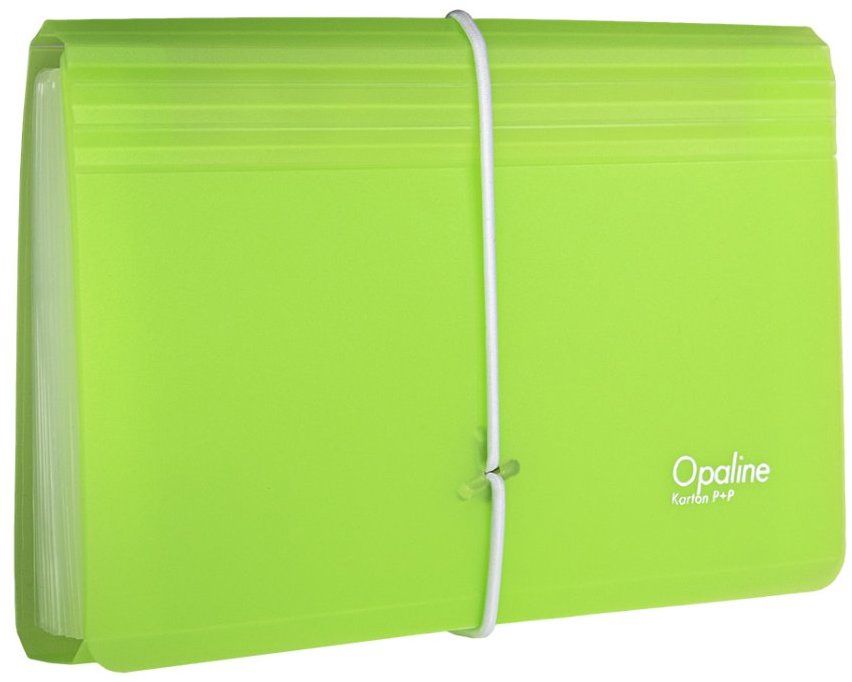 Dosky na dokumenty – plastové, DL, aktovka na dokumenty vo vnútri, 13 priehradiek, na gumičku, zelená farba Kľúčové vlastnosti dosiek na dokumenty KARTON P+P Opaline organizér na dokumenty s gumou (13 vreciek) DL, zelený Dosky na dokumenty Karton P+P vo forme aktovky Uzavieranie rieši gumička Členenie na 13