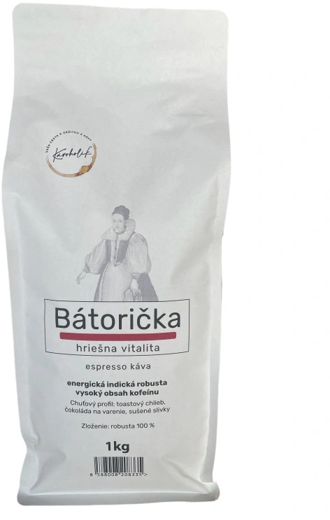 Káva – zrnková, 100 % Robusta, stredný stupeň praženia, pôvod India, miesto praženia Slovensko, hmotnosť balenia 1000 g, hmotnosť porcie 9 g, bez alergénov Káva KÁVOHOLIK Bátorička100 % robusta, 1 kgKáva KÁVOHOLIK Bátorička je tvorená 100 % Robustou pôvodom z Indie. V jej chuti objavíte tóny toastového chleba, čokolády na varenie a sliviek. Vysoký obsah