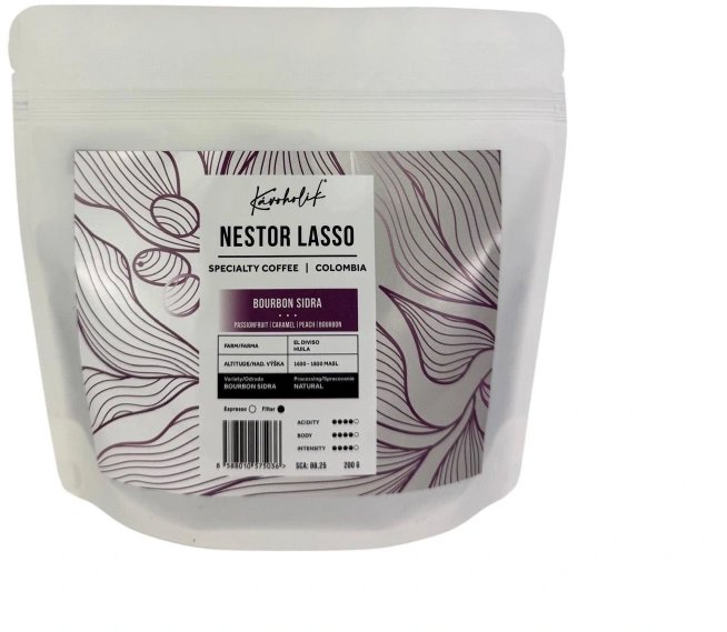 Káva – výberová zrnková, 100 % Arabica, svetlý stupeň praženia, na filtrovanú kávu, pôvod Kolumbia, miesto praženia Slovensko, suchá/natural, fair Trade, hmotnosť balenia 200 g, bez alergénov Zrnková káva KÁVOHOLIK Kolumbia, Nestor Lasso, Bourbon SidraNatural, 200 gIdeálna na prípravu na filtriZrnkovú kávu KÁVOHOLIK Kolumbia, Nestor Lasso tvorí 100 % Arabika odroda Bourbon Sidra. V jej chu