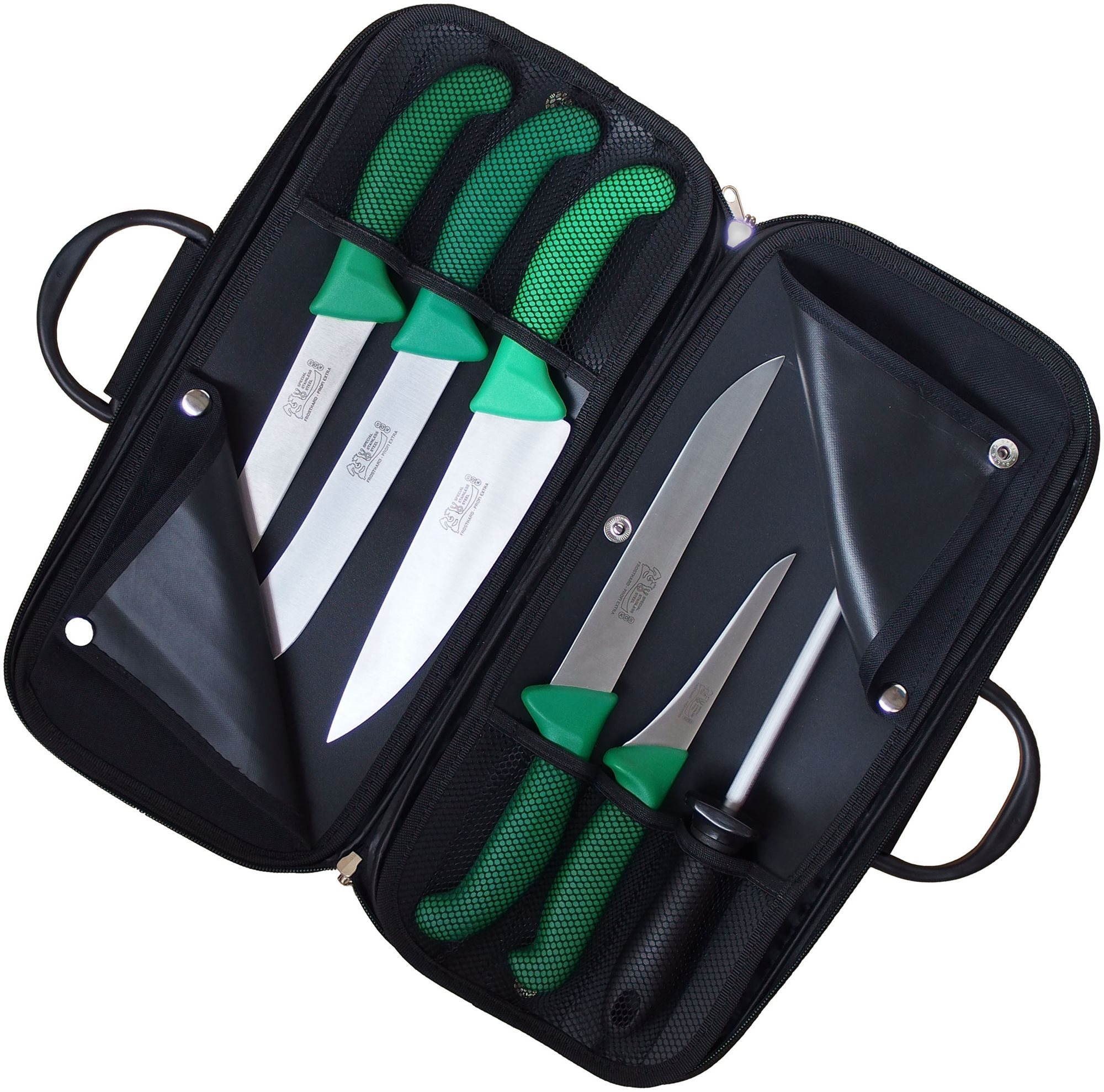 Sada nožov – mäsiarsky nôž, materiál čepele nehrdzavejúca oceľ, ocieľka súčasťou balenia, 6 kusov v súprave Kľúčové vlastnosti zelenej súpravy mäsiarskych nožov a tašky KDS Frosthard. Taška s piatimi mäsiarskymi nožmi 4× Frosthard, 1× Profi line…