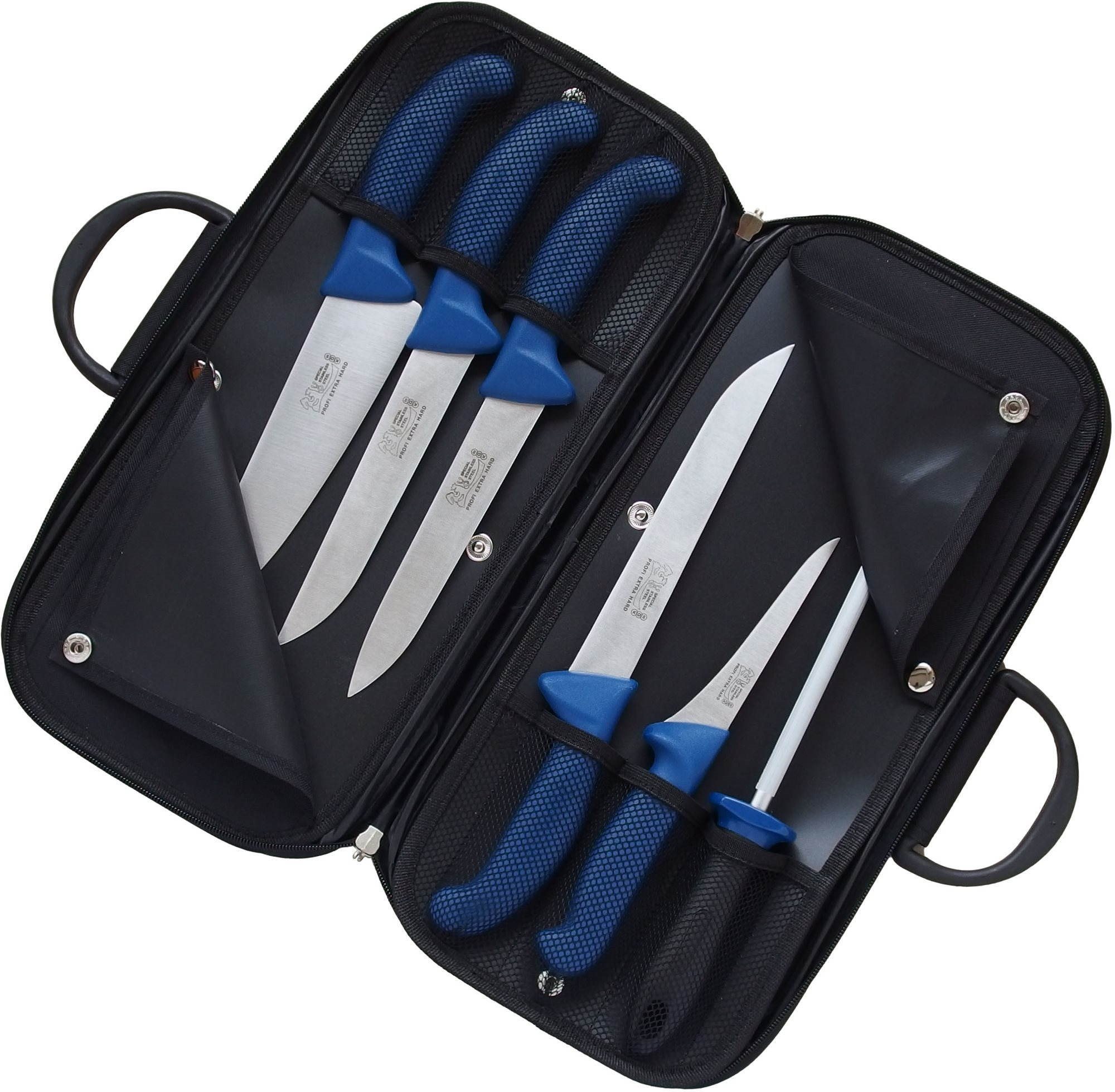 Sada nožov – mäsiarsky nôž, materiál čepele nehrdzavejúca oceľ, ocieľka súčasťou balenia, 6 kusov v súprave Kľúčové vlastnosti modrej sady mäsiarskych nožov s káblom KDS Profi lineKáble s piatimi mäsiarskymi nožmi s modrou rukoväťouVrátane ocieľkyMateriálom čepele je nehrdzavejúca oceľSada obsahuje nôž mäsi