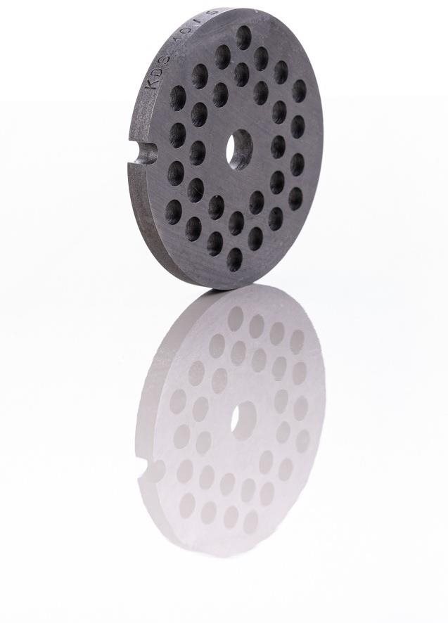 Doska do mlynčeka na mäso – železná, okrúhly tvar, vonkajší priemer 69,5 mm, priemer stredového otvoru 10 mm, priemer otvorov 6 mm, pre mlynčeky veľkosti 10 Řezná deska, šajba slouží jako deska do masostrojku na mletí masa, ale i jiných surovin. Velikost otvorů určuje výslednou zrnitost namleté suroviny. Pro zachování co nejdelší životnosti doporu