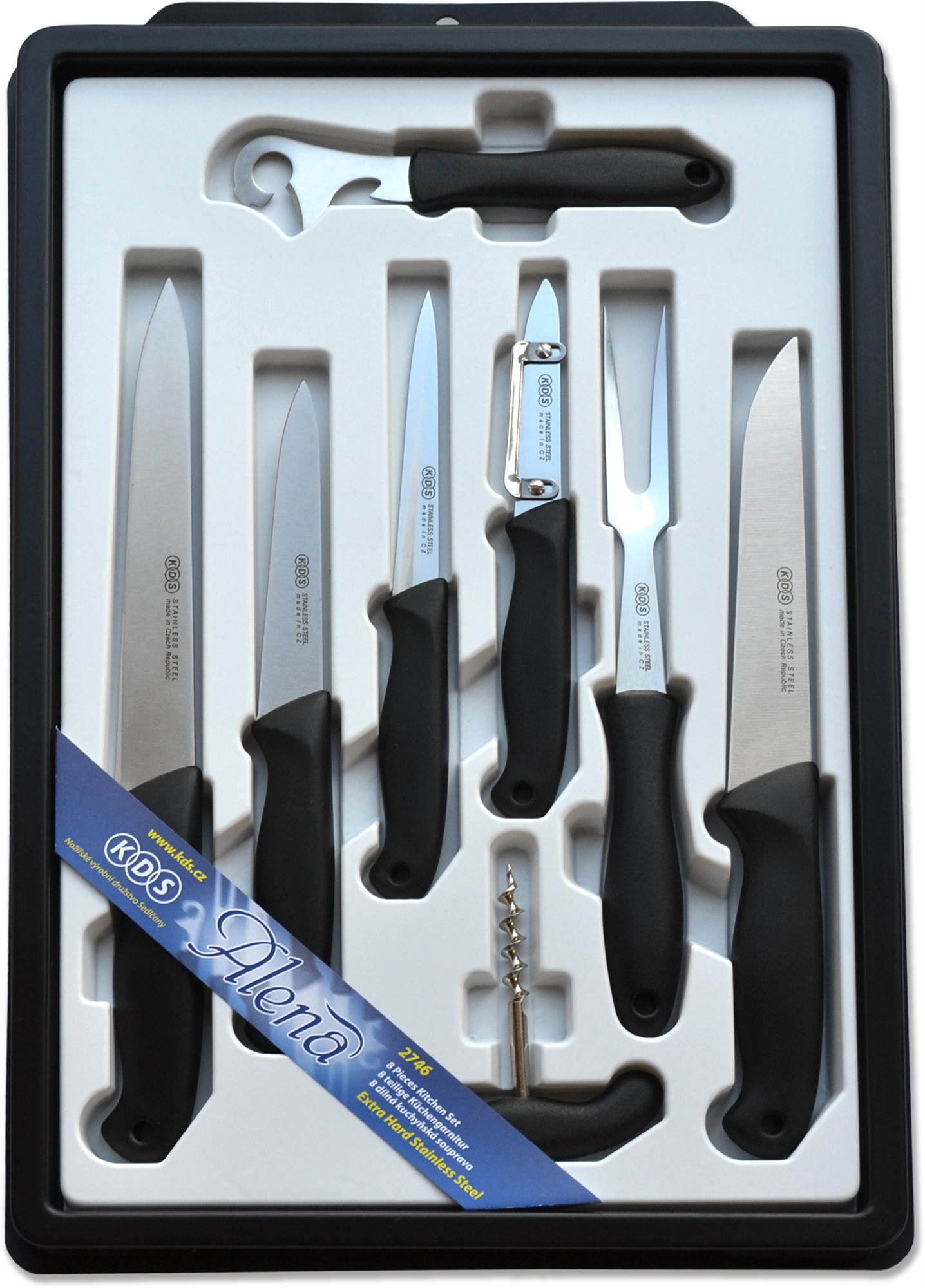 Sada nožov – kuchársky nôž a vidlička, materiál rukoväti plast, materiál čepele oceľ, škrabka súčasťou balenia, vhodné do umývačky, 8 kusov v súprave Kľúčové vlastnosti súpravy nožov KDS, súprava ALENA8 kusov v súpraveMateriál rukoväte je plast, materiál čepele je oceľVhodná do umývačky riaduHmotnosť balenia je 500 gRozmery balenia sú 250 × 20 × 38