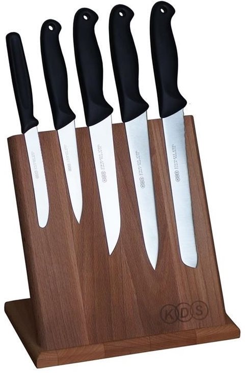 Sada nožov – kuchársky nôž a nôž na pečivo, materiál rukoväti plast, materiál čepele oceľ, stojan na nože súčasťou balenia, 5 kusov v súprave Súprava nožov Optima line tradičného českého výrobcu KDS ponúka vysoko kvalitných pomocníkov do kuchyne. Súprava obsahuje magnetický stojan z kvalitného bukového dreva a päť praktických nožov rôznej d