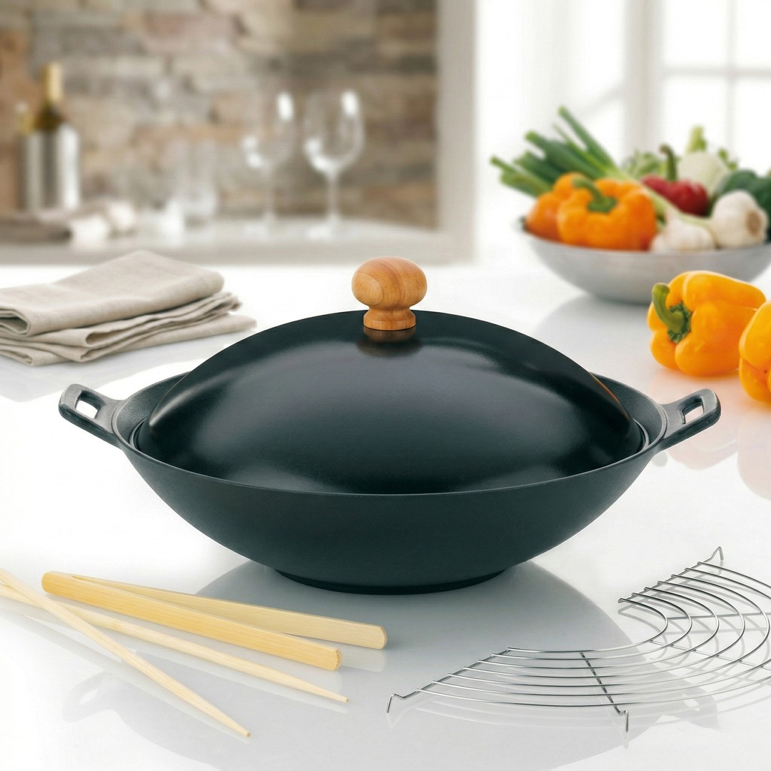 Wok panvica – liatinová, okrúhla, vhodná na elektrickú, plynovú, sklokeramickú aj indukčnú varnú dosku, možnosť použitia neostrého kovového náčinia a vhodná do rúry, liatinový vonkajší povrch, oceľová, pokrievka v balení, výška 10 cm, priemer horného okraja 36 cm, vonkajší priemer dna panvice 15,5 cm, čierna farba Praktická WOK súprava, vám prináša nepostrádateľnú liatinovú panvicu WOK, s príslušenstvom. Táto panvica je ideálnym pomocníkom pre prípravu čoraz obľúbenejšej, pestrej ázijsk