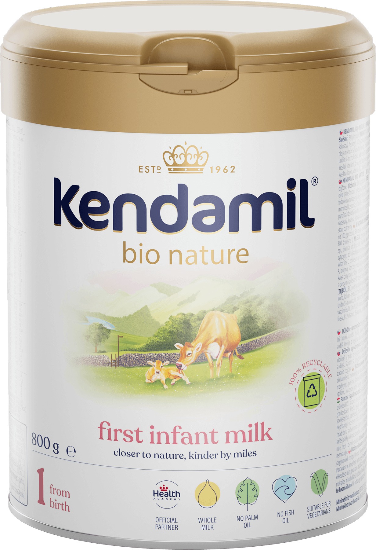 Dojčenské mlieko Kendamil Organic – počiatočné, bez pridaného cukru, bez prídavku soli, s kravským mliekom (mliečny tuk), bio kvalita a bez palmového oleja, vhodné od 0 mesiace, veková kategória 1, hmotnosť 800 g Kendamil BIO Nature 1 DHA+Základom BIO Nature Počiatočného mlieka DHA+ je plnotučné mlieko, ktoré pochádza z lokálnych fariem od voľne sa pasúcich kráv v bezprostrednej blízkosti Národného parku Lake