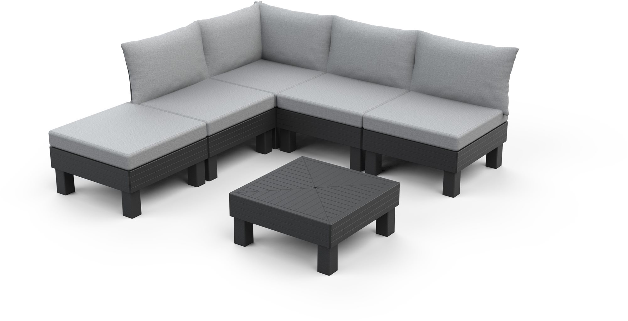 Záhradný nábytok – zostava, 2 stoličky, nosnosť 110 kg, 1 lavice, nosnosť 330 kg, stôl štvorec, rozmer 65 cm × 65 cm × 25 cm, materiál dosky stola plast, materiál sedadla/opierky chrbta lavice textil Set ELEMENTS je ideálnym riešením pre tých, ktorí hľadajú flexibilné a pohodlné posedenie v záhrade, terase alebo pri bazéne. Vďaka modulárnemu systému môžete ľahko prispôsobiť konfiguráciu jednotlivý