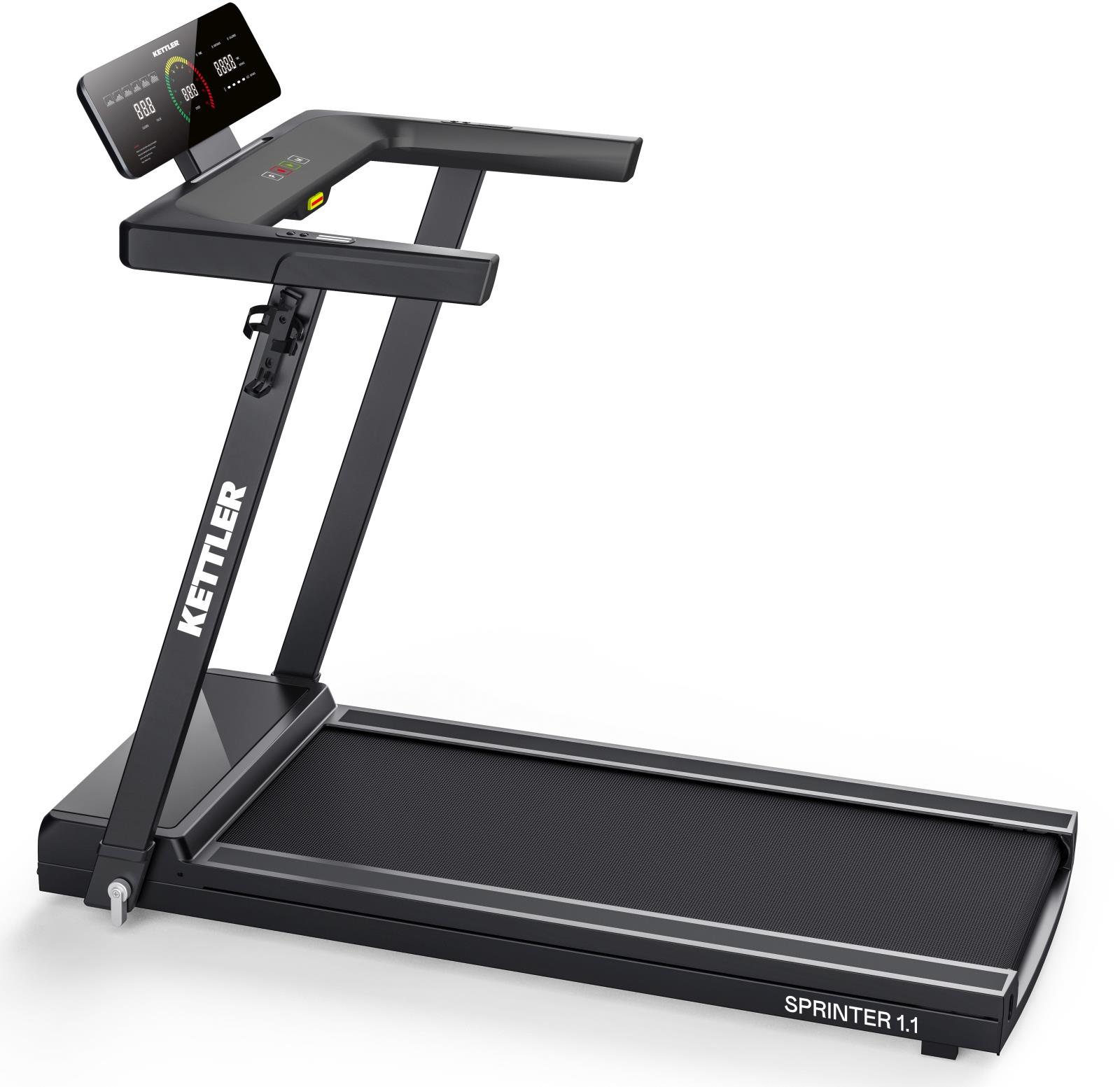 Bežecký pás – motorový, skladací, rýchlosť až 16 km/h, výkon motora 1,74 HP, max. výkon 1,75 HP, rozmery behacej plochy 122 × 45 cm (D׊), displej, transportné kolieska, bluetooth a meranie spálených kalórií, 40 programov, meranie pulzu hrudným pásom (nie je súčasťou) a na riadidlách, pripojenie cez Bluetooth a ANT+, nosnosť 110 kg, celkové rozmery 125 × 72 × 152 cm (V׊×H) Kettler Sprinter 1.1. je motorový skladací bežecký pás, ktorý vyniká skvelou výbavou na každodenné domáce použitie, kompaktnými rozmermi a intuitívnym ovládaním. Vďaka rýchlosti až 16 km/h, presnému n