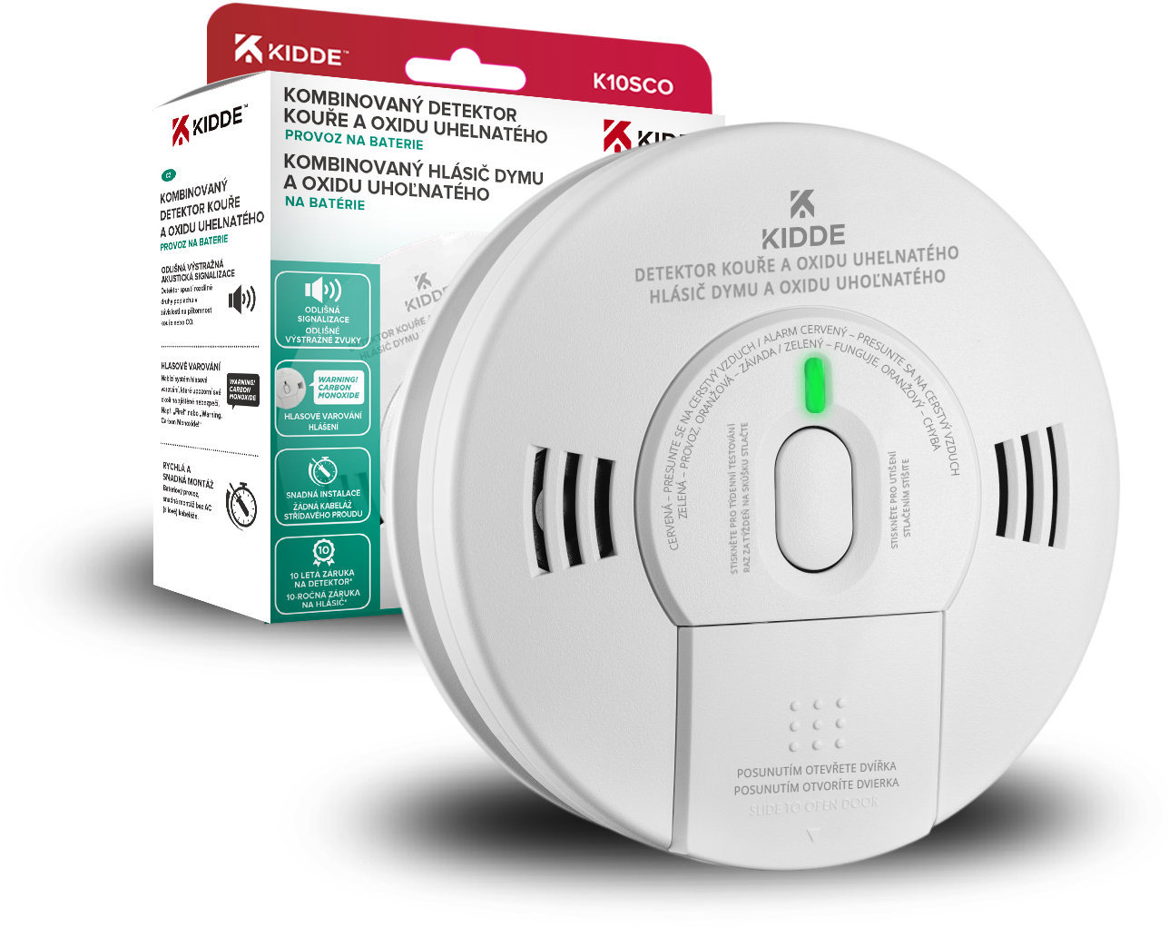 Detektor dymu – detekcia CO (oxidu uhoľnatého), rozsah merania od 0 ppm, batériové napájanie, akustická signalizácia, hlasitosť 85 dB, indikácia stavu batérie, materiál krytu plast, prevádzková teplota od 0 do 40 °C, prevádzková vlhkosť od 10 do 90 %, samostatne funkčná jednotka Kombinovaný hlásič požiaru a oxidu uhoľnatého (CO) – KIDDE K10SCOPredstavujeme vám batériovo napájané kombinované zariadenie 2 v 1 na zistenie požiaru, dymu a smrteľného nebezpečenstva v podobe oxidu
