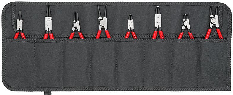Sada klieští – rovné a zahnuté, vonkajšie a vnútorné, rozsah čeľustí od 12 do 60 mm, ergonomická rukoväť z plastu, 8 typov klieští v balení Súprava 8 precíznych klieští pre vnútorné aj vonkajšie poistné krúžky. Súprava je dodávaná v praktickom obale, ktorý je vhodný aj pre ďalšie uloženie klieští.Kľúčové vlastnosti súpravy klieští Knipex