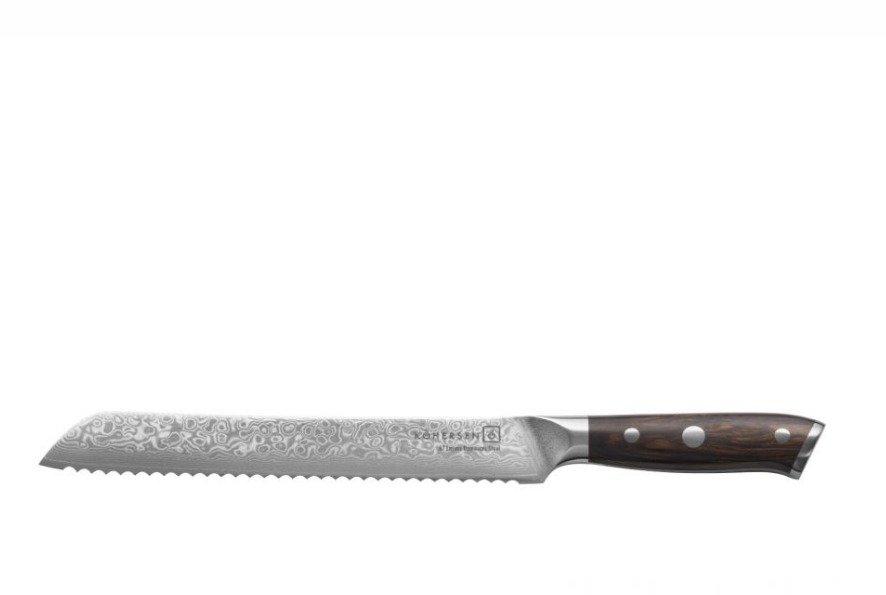 Kuchynský nôž – materiál čepele: damascénska oceľ, dĺžka čepele 22,9 cm, nôž na chlieb, materiál rukoväti: drevo Kuchynský nôž na chlieb Kohersen Chef´s Elegance je prémiový kuchynský nôž, u ktorého kvalita čepele patrí medzi hlavné prednosti. Čepeľ je vyrobená z damaškovej ocele, ktorá pozostáva zo 67 vrstiev k