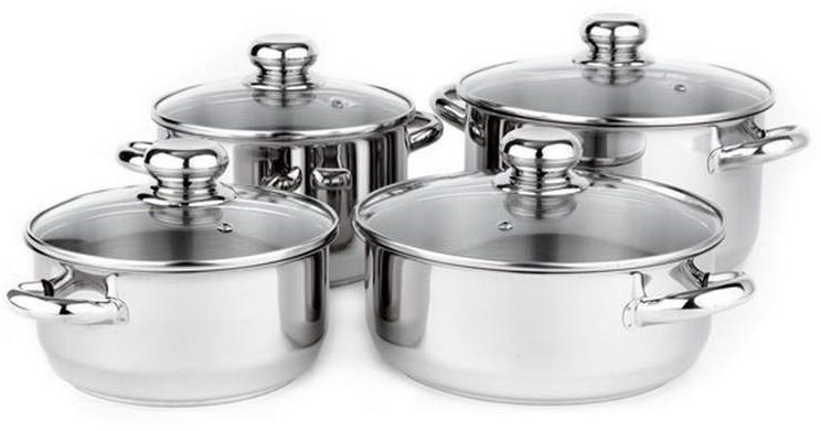 Sada riadu na varenie – na plynovú, elektrickú, indukčnú, sklokeramickú a halogénovú varnú dosku, 4 hrnce v súprave, možnosť použitia neostrého kovového náčinia a možnosť umývania v umývačke, maximálna teplota na pečenie v rúre 300…
