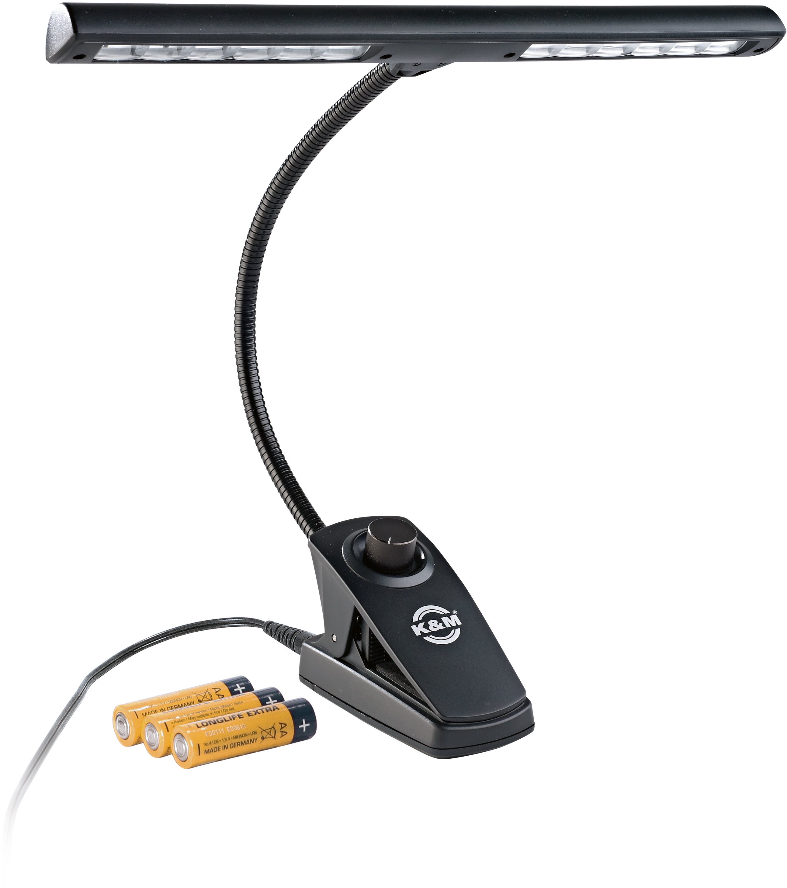 Lampička na noty – klipsová, rameno husí krk, integrované LED svetlo, na 3 AA batérie, čierna farba Lampička na noty König & Meyer vychádza z potrieb hráčov na hudobné nástroje. Slúži na osvietenie nôt, z ktorých hráte, a zároveň na nich nezanecháva tiene, s čím sa stretávame pri iných svietidlách.