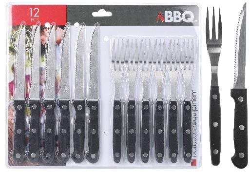 Súprava príborov – jedálenská vidlička a steakový nôž, so zúbkovaným ostrím, 6 súprav s celkovým počtom 12 ks Milujete šťavnaté steaky? Čo si ich takto vychutnať so sadou príborov Koopman? Sú vyrobené z nehrdzavejúcej ocele a plastu. Nože sú na ľahké krájanie aj naberanie opatrené vysoko kvalitnou čep