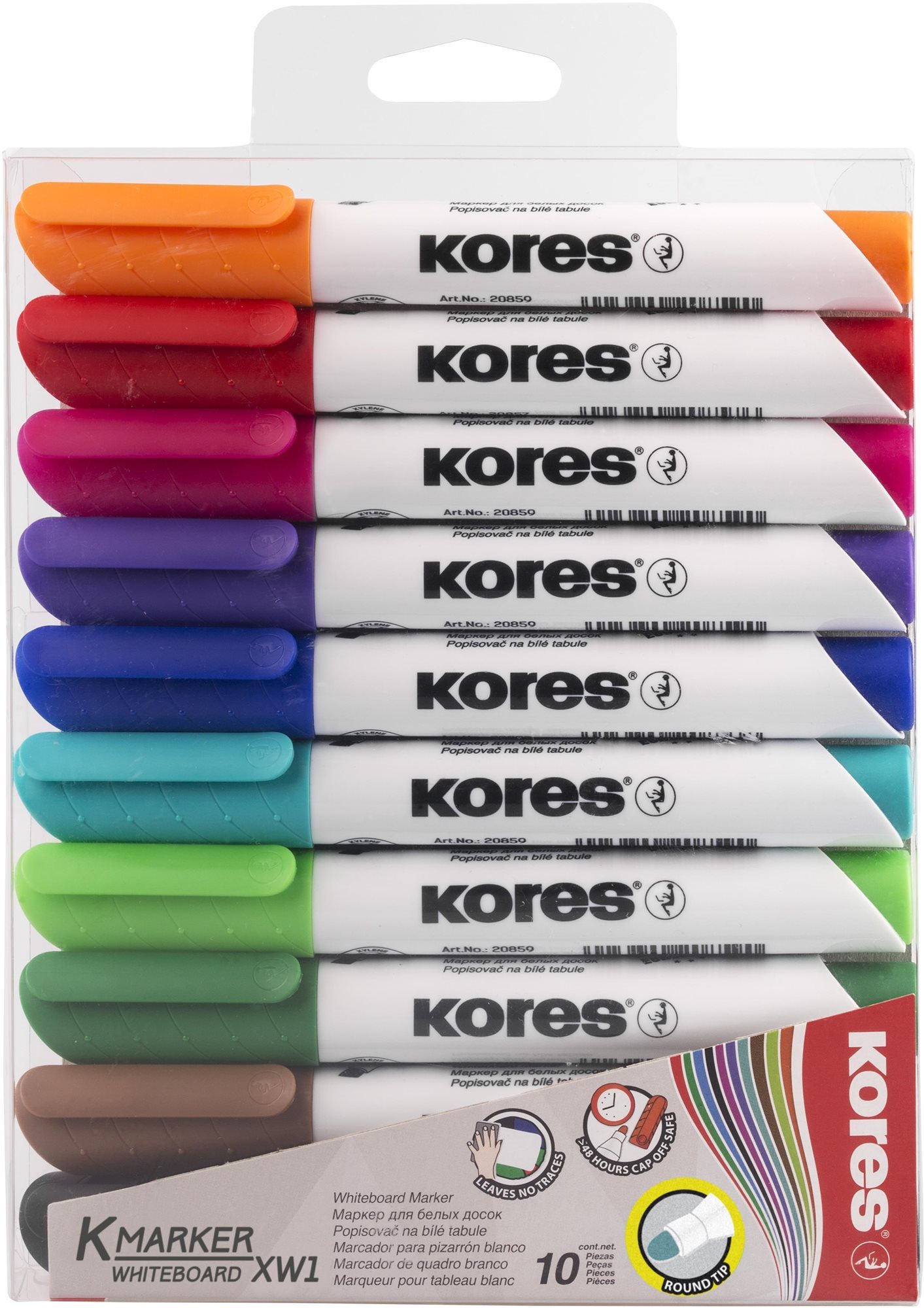 Popisovač – na tabuľu, rýchloschnúci, guľatý hrot, šírka stopy 3 mm, okrúhly úchop, škatuľka a 10 popisovačov v balení Súprava popisovačov na biele tabule a flipchartyNa každodennú prácu v kancelárii či v škole vám skvele poslúži súprava fixiek od značky KORES. Pri rôznych rokovaniach, schôdzkach či školeniach vám vžd