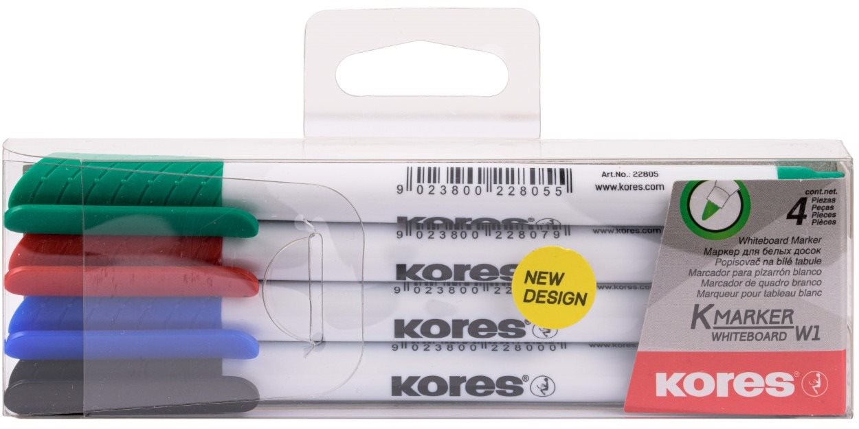 Popisovač – na tabuľu, atramentový, rýchloschnúci, guľatý hrot, šírka stopy 2 mm, okrúhly úchop, škatuľka a 4 popisovače v balení Súprava popisovačov na biele tabule a flipchartyNa každodennú prácu v kancelárii či v škole vám skvele poslúži súprava fixiek od značky KORES. Pri rôznych rokovaniach, schôdzkach či školeniach vám vžd