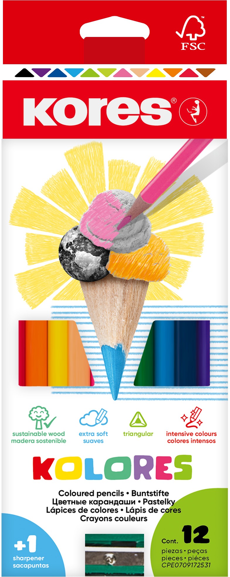 Pastelky KORES – trojhranné, pre pravákov aj ľavákov, ergonomický úchop, na papier, klasické farby, mäkká tuha s priemerom 3 mm, papierové balenie, strúhadlo a 12 pasteliek v balení Pastelky KORES sú kúzelnými sprievodcami tvorivého sveta, ktorými možno vyjadriť svoje najhlbšie emócie na kus papiera. Vďaka ich trojhrannému tvaru sa s nimi bude ľahko manipulovať. Tieto pastelky pr