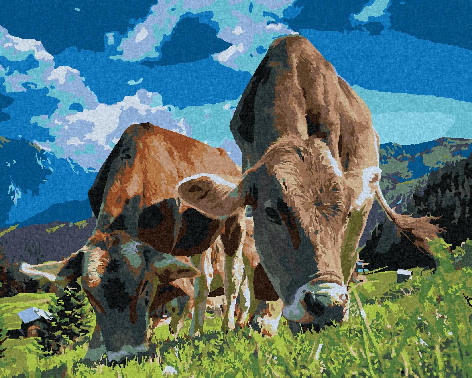 Maľovanie podľa čísel – tematika zvieratá, stredná náročnosť, plátno, súprava štetcov, farby a vymaľovaný vzor súčasťou balenia, rozmery 100 × 80 cm (V׊) Kľúčové vlastnosti maľovania podľa čísiel Kravy v horách, 80 × 100 cm, bez rámu a bez vypnutia plátna Maľovanie podľa čísel je vhodné pre všetkých tvorivých ľudí Materiálom plátna je ľan Rozmery maľov