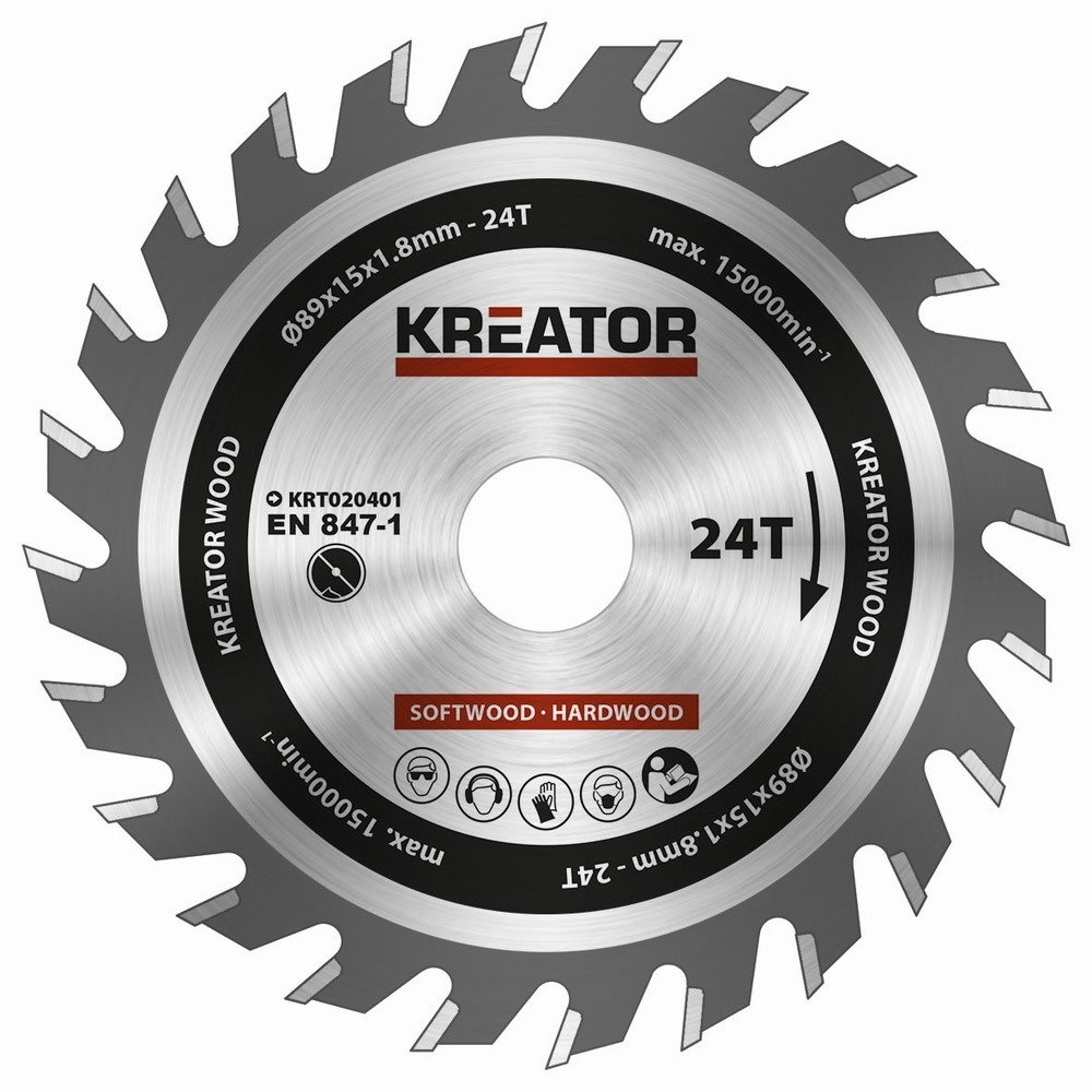 Pílový kotúč – na drevo, rozmery 89 × 15 mm (vonkajší priemer × otvor), materiál oceľ, 24 zubov, striedavo šikmý tvar zubov, pozitívny sklon zubov, 20° uhol čela zubov a redukčné krúžky vo veľkosti 10 mm v balení Kľúčové vlastnosti pílového kotúča Kreator KRT020401 Pílový kotúč Kreator je vhodný na drevo Striedavo šikmý tvar zubov umožňuje rýchle a precízne rezanie bez toho, aby vznikali nežiaduce otrepy Kotúč