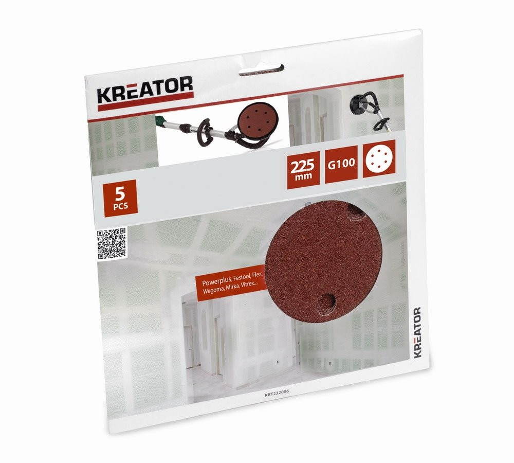 Brúsny papier – pre brúsky POWX0476, POWX0477, POWX0478, priemer 225mm, zrnitosť G100, 5ks Brúsne kotúče vhodné pre brúsenie rozličného materiálu Kreator vám uľahčí nejeden zložitý pracovnú úlohu. Kotúče s priemerom 225 mm a zrnitosťou G150 sa ľahko a intuitívne mení. Tento produkt je vhodn