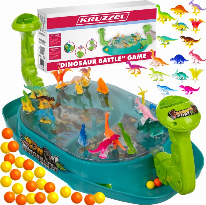 Spoločenská hra – detská hra, pre 2 hráčov, ľahká obťažnosť, vhodné od 3 rokov Společenská hra Kruzzel 24656 má jednoduchá pravidla. Stačí umístit dinosaury na plán na příslušná místa, vhodit kuličky do joysticků a zahájit palbu. Vítězí hráč, který nejrychleji vyřadí soupeřovy d
