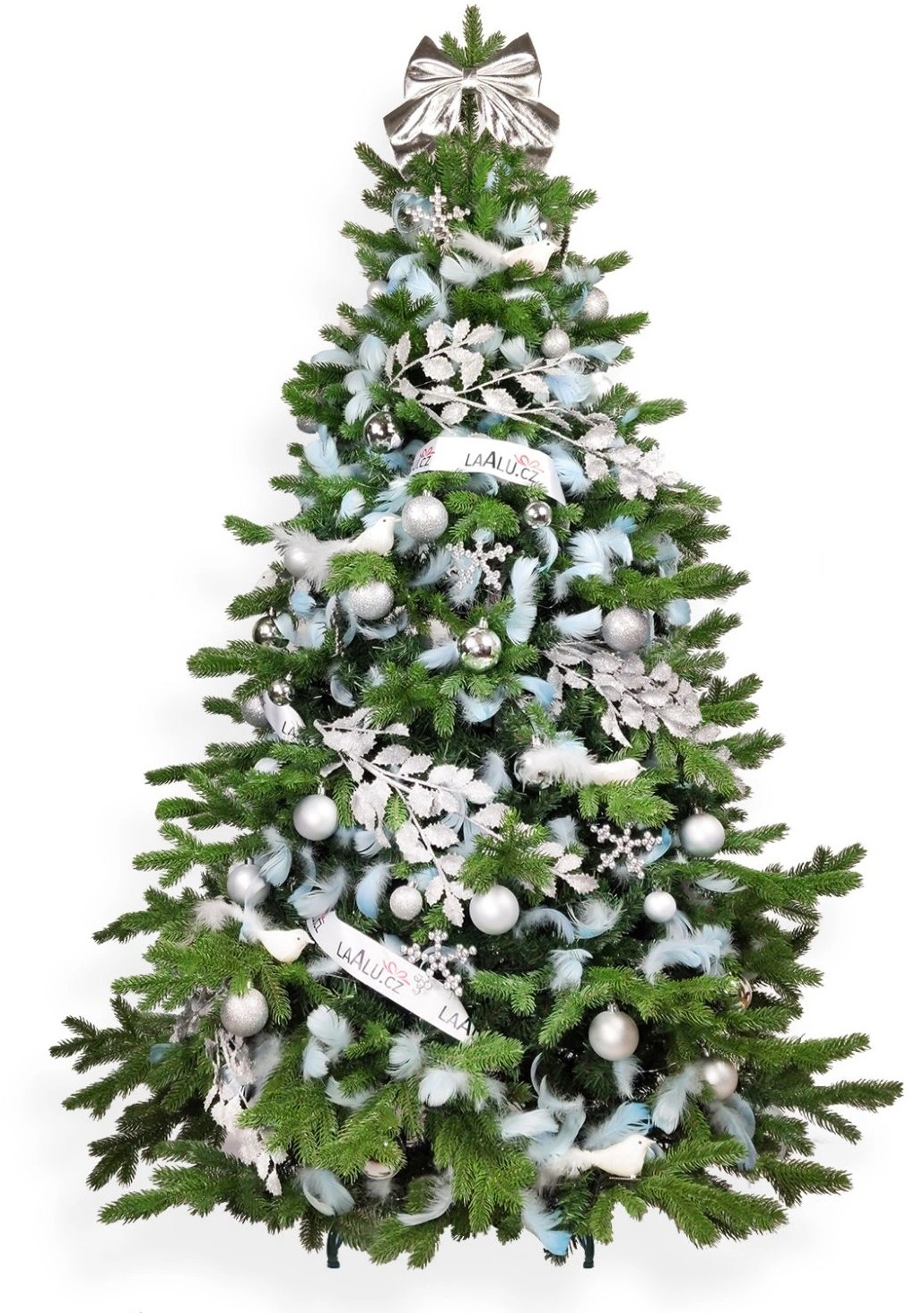 Vianočný stromček – umelý, jedle s 3D ihličím, zelený, výška 240 cm, šírka 144 cm, do interiéru, vo výbave stojan, ozdoby, biela, strieborná a modrá farba ozdôb Kľúčové vlastnosti umelého vianočného stromčeka LAALU Ozdobený stromček NEBESKÉ STRIEBRO 240 cm, 131 ks ozdôb a dekorácií Umelý vianočný stromček LAALU je prispôsobený na použitie vo vnútri Vzhľadom a
