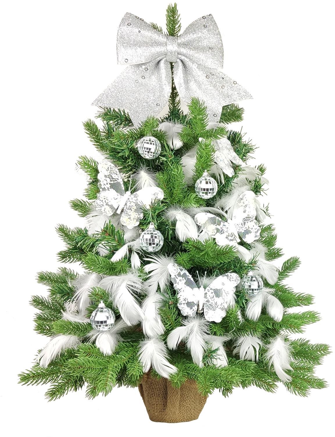 Vianočný stromček – umelý, jedle s 3. D ihličím, zelený, výška 60 cm, šírka 40 cm, do interiéru, vo výbave stojan, ozdoby, biela a strieborná farba ozdôb Kľúčové vlastnosti umelého vianočného stromčeka LAALU Ozdobený stromček STRIEBORNÉ…