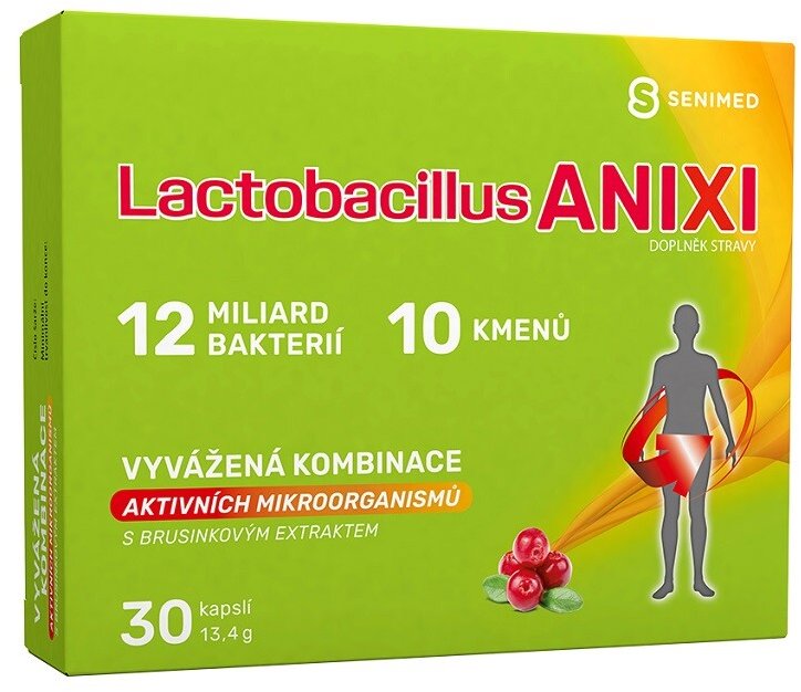 Probiotiká – kombinácia 10 probiotických kmeňov, extraktu z kanadskej brusnice (100 mg), fruktooligosacharidy (40 mg) v 1 kapsule, pre dlhodobé užívanie, 30 kapsúl Lactobacillus Anixi40 kapsúlLaktobacily a bifidobaktérie patria medzi prirodzené „priateľské“ baktérie, ktoré osídľujú náš zažívací trakt a starajú sa o správnu funkciu trávenia i celkovú pohodu organ